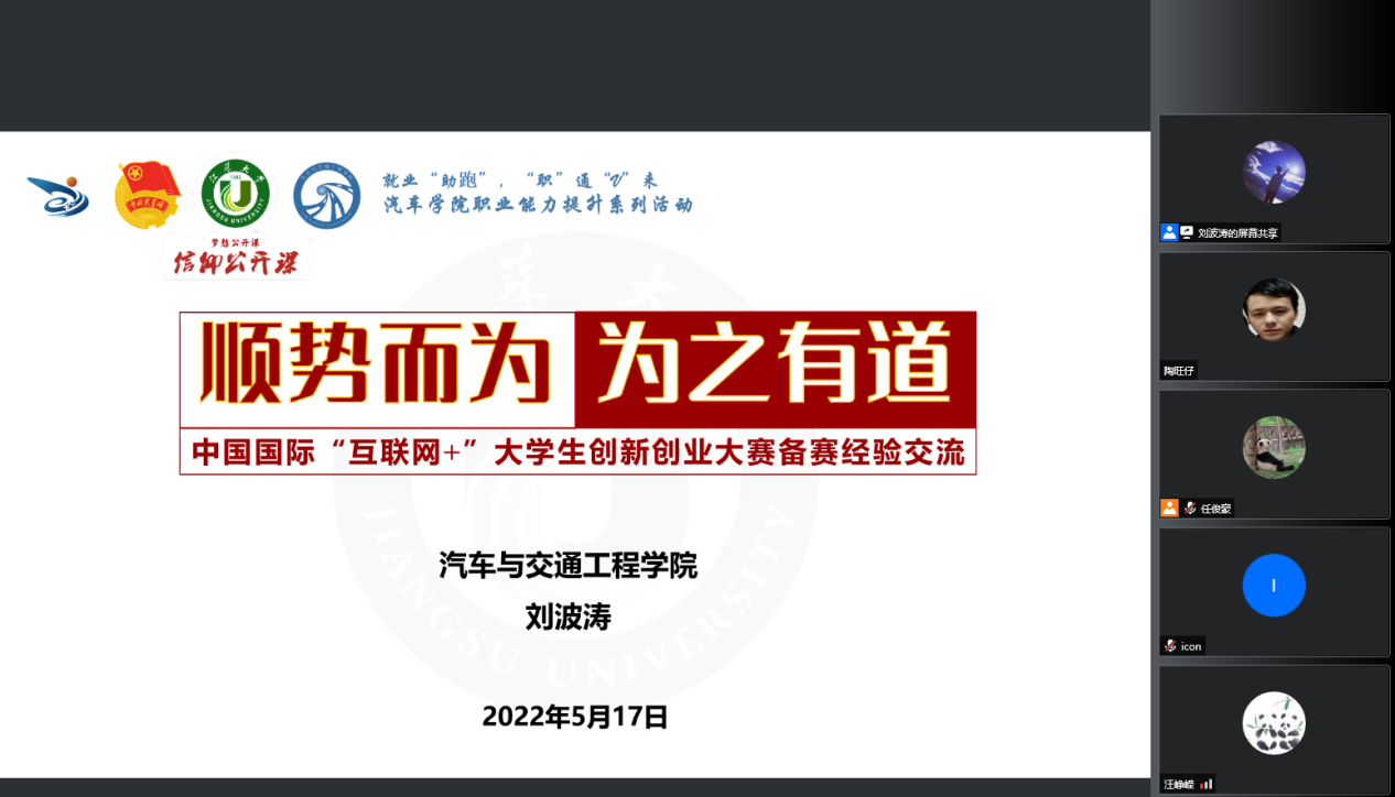 为进一步帮助我院师生备战“互联网+”大学生创新创业大赛,5月17日,汽车学院通过腾讯会议APP举办“互联网+”大学生创新创业大赛指导会。本次交流会由辅导员刘波涛老师主讲,100余名师生参加。