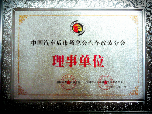 汽车后市场总会和汽车改装分会联合颁发的“中国汽车后市场总会汽车改装分会理事单位”的奖牌。