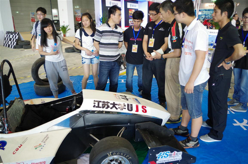 我校汽车学院江苏超力FSAE赛车队作为一支参加过3届中国大学生方程式汽车大赛的车队,很荣幸地受邀参加了本次博览会,并与其它来自全国各地的10支车队,展示了每个团队的奋斗的成果——FSAE赛车。